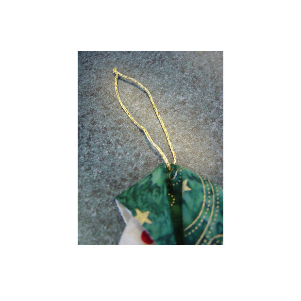 Agora, para finalizar, aplique um cordão ou uma fita na ponta do seu trabalho para que o seu enfeite possa ser pendurado.