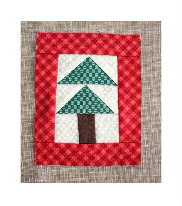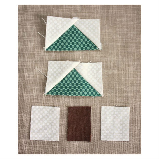 Utilize ¼” da costura nas emendas restantes, costurando ¼ de triângulo verde em cima do outro bloco de triângulo para dar formato à árvore.