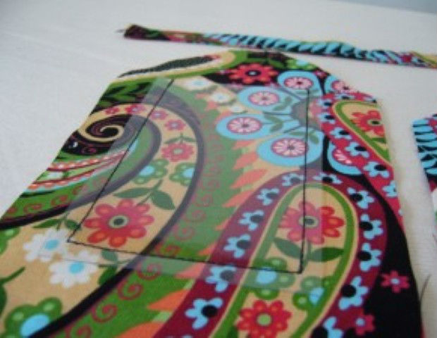 A seguir, recorte um triângulo de vinil transparente e costure-o sobre uma das partes do seu tecido, como na imagem acima, de modo a deixar uma abertura livre para a entrada do papel aonde você irá colocar seus dados de identificação.