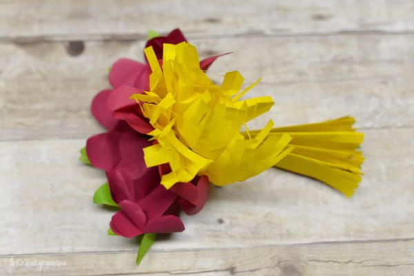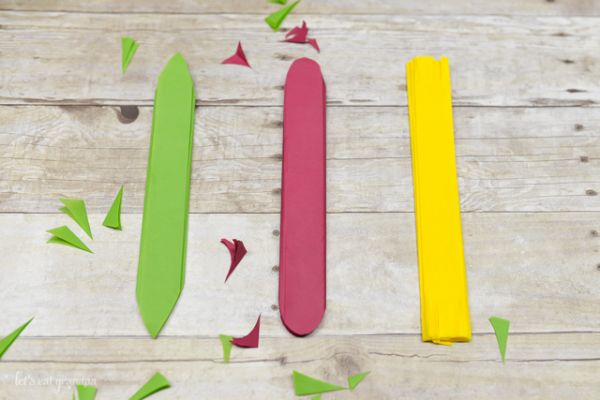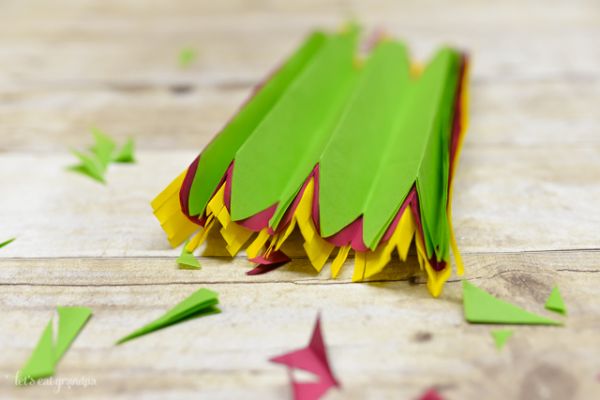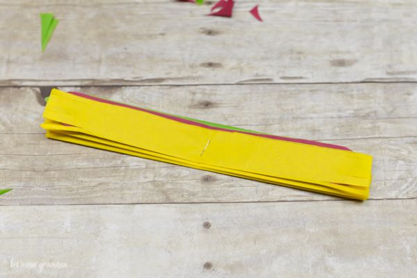 Agora, sanfone cada cor de papel novamente. E corte as pontas do papel verde em formato de ponta de lança; no papel vermelho (que será a flor) corte as pontas do papel em formato arredondado; e no papel amarelo (que será o miolo da flor), corte tirinhas nas duas pontas do papel.