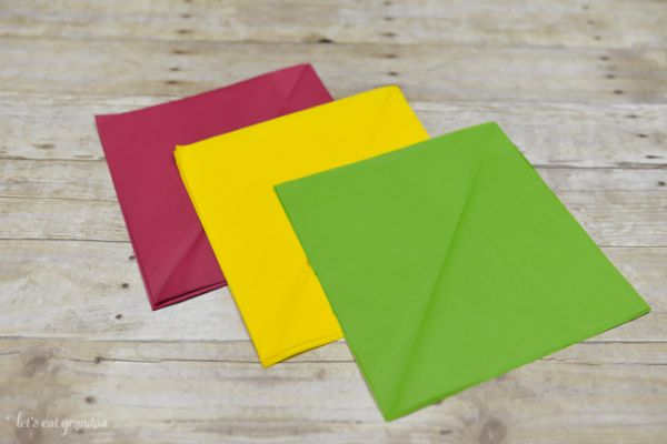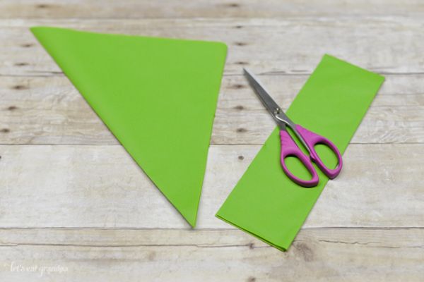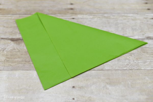 Comece dobrando a folha de papel de seda verde ao meio duas vezes e depois dobre de forma que crie um triângulo.