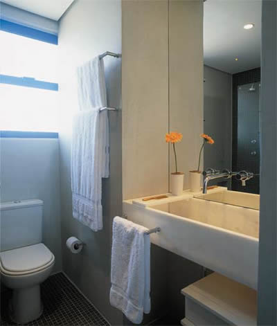 Observe que este banheiro é bem pequeno mas está com todos os itens necessários. Tem traços de simplicidade e o piso é composto de pastilhas neutras na cor preta.