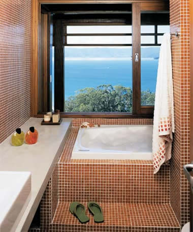 Este banheiro está em perfeita sintonia com o mar que debruçasse pela janela. Pastilhas de cor alaranjada que junto com a claridade te transportam para junto da paisagem.
