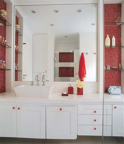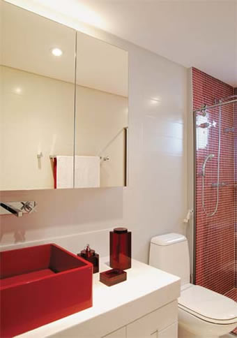 Espelhos grandes sempre são bem vindos e neste caso foi utilizado para ampliar a visão e reduzindo os itens do ambiente. As pastilhas vermelhas sempre compondo os detalhes e deixando tudo mais charmoso.