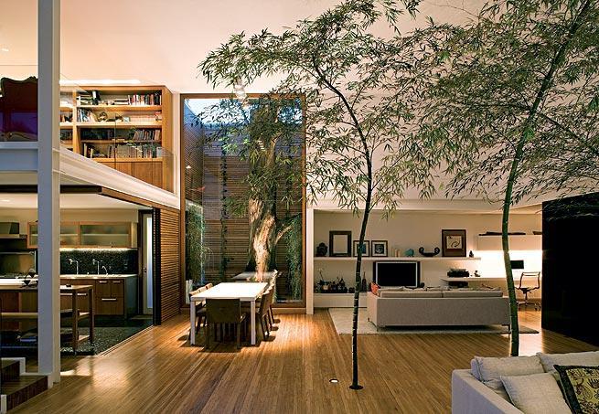 O jardim interno proporciona muito estilo, elegância e aconchego para a casa. É algo ainda bastante inusitado, mas não há como resistir a um ambiente “decorado” assim.