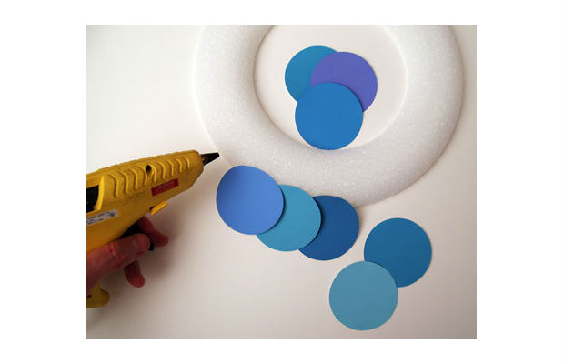 Cole círculo por círculo com cola quente sobre a grinalda de isopor.