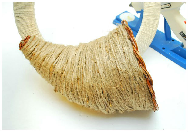 A seguir, envolva a sua cornucópia com o fio de juta, usando cola quente.