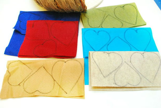 Logo, desenhe corações nos seus feltros coloridos.
