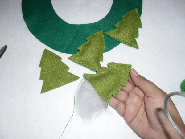 Costure e encha os pinheiros. Aplique cola branca e jogue glitter. Costure as pedrarias no meio dos pinheiros. Para finalizar a sua peça, costure todas as peças na base da guirlanda e amarre pedaços de fitas, fazendo laços. E está pronto!