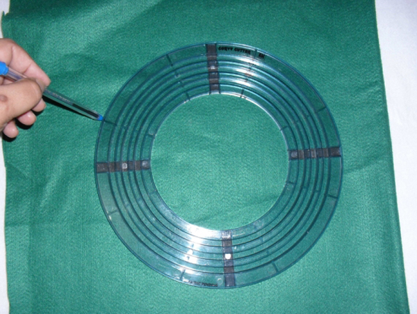 - Régua circular, objeto circular ou um compasso, para servir de molde para um círculo;