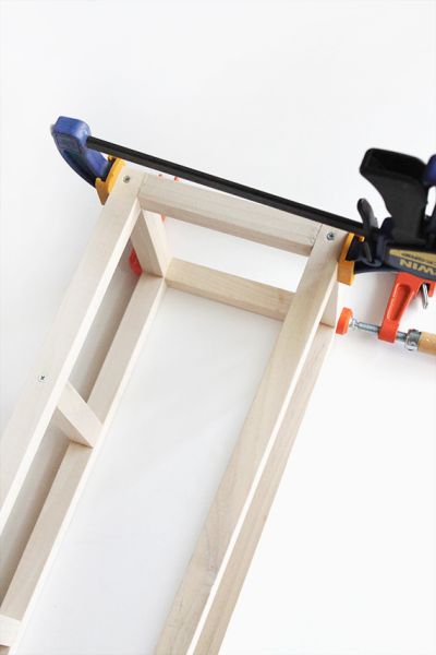 Em seguida, comece a fazer a estrutura da sua peça, unindo um pedaço de madeira grande ao outro com o auxílio dos pedacinhos pequenos sendo posicionados entre um e outro. Para unir os pedaços de madeira, primeiramente aplique a cola para madeira e depois fixe os pedaços de madeira com o auxílio de um prego.
