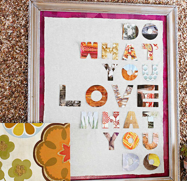 Outra ideia bem banaca é esse lindo quadro decorativo com frases em letras feitas com papeis coloridos e diferentes. Quanto mais colorido e estampado, mais sofisticado ficará o quadro.