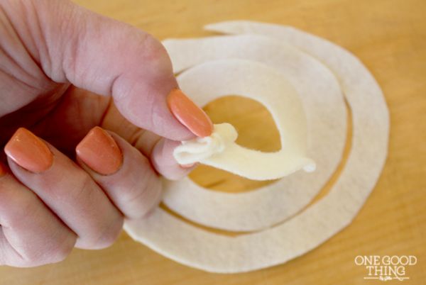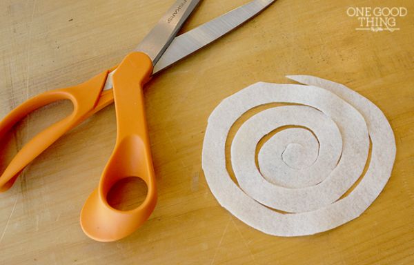 Comece separando todos os materiais que você vai utilizar em seu artesanato. Depois corte um espiral no feltro escolhido.