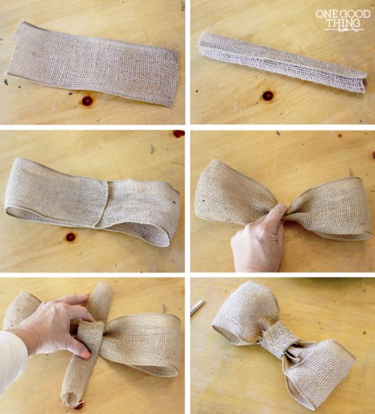 Em seguida, faça o laço com a fita de juta. Cole um pedaço de fita de juta, para fazer a parte central do laço. Depois monte a base do laço, com a fita aberta. E por último cole a parte central ao redor do meio da base do laço.