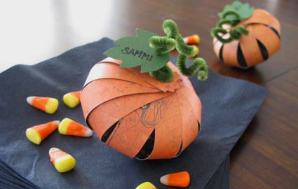Faça uma abóbora de papel laranja, com tiras que gira, e que guarda dentro de si algumas guloseimas. As tiras são presas nas extremidades com tachas para papel com as garrinhas presas de maneira mais solta. Faça este processo nas duas pontas das tiras de papel. Assim você pode deslizar as tiras de papel ao redor da tachinha e encher a sua abóbora com guloseimas. Os detalhes de sua abóbora ficam por conta de um pedaço de limpador de cachimbo com a cor verde e uma folha verde feita também com papel estruturado.