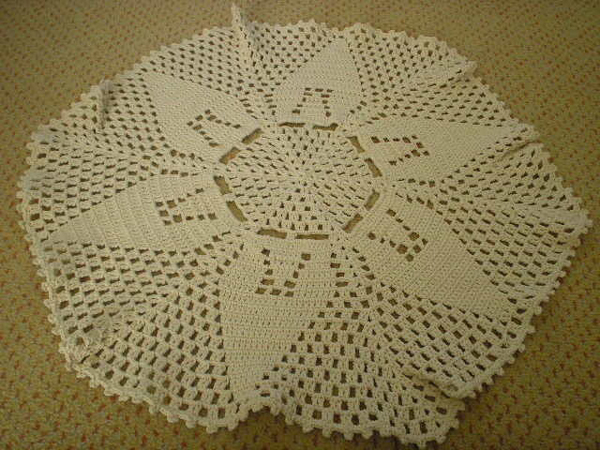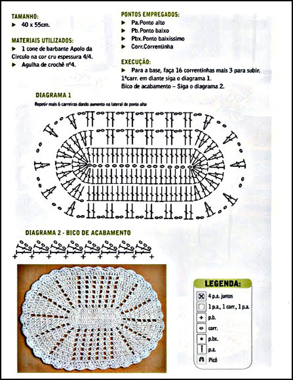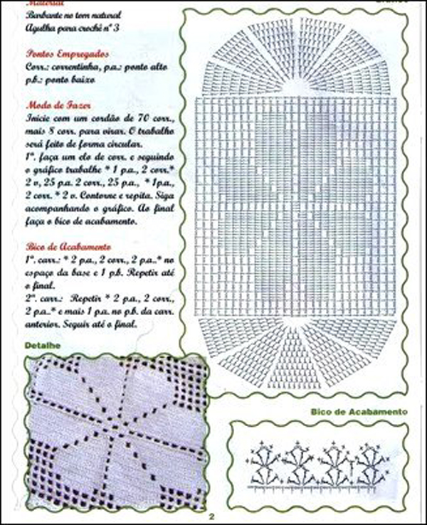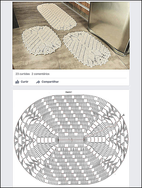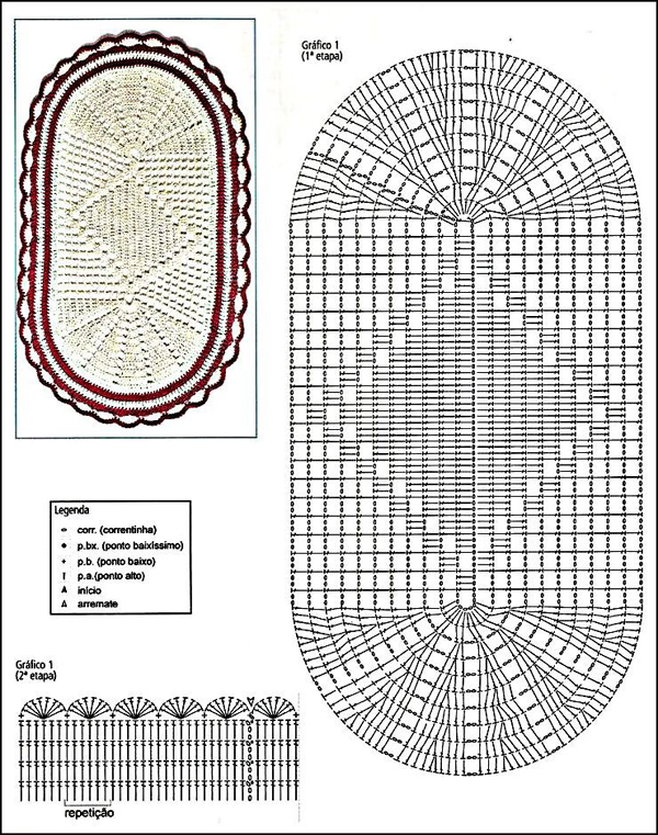 Faça um cordão de correntinhas com o comprimento com o tamanho que você quer para a largura do seu tamanho. Faça 2 carreiras de pontos altos. Faça 3 correntinhas e mais 10 pontos altos. Faça 2 correntinhas, 1 ponto alto, 2 correntinhas, 1 ponto alto, 2 correntinhas, até faltar 11 pontos para o final da carreira, pois neste ponto você vai fazer 11 pontos altos como fez no início. Agora basta ir seguindo o gráfico, que é muito simples, pois só possui pontos altos e correntinhas. Quando chegar ao tamanho desejado para o tapete, faça 2 carreiras de pontos altos, como fez com as 2 primeiras carreiras. Se você quiser, pode fazer um biquinho ao redor de todo o tapete.