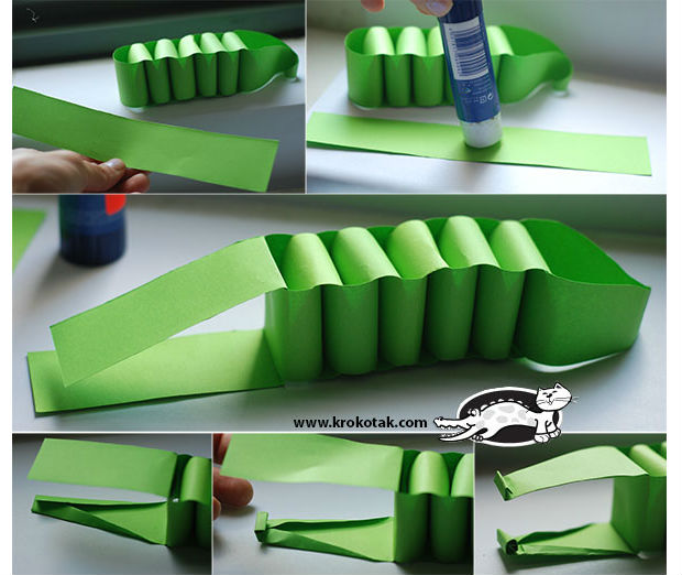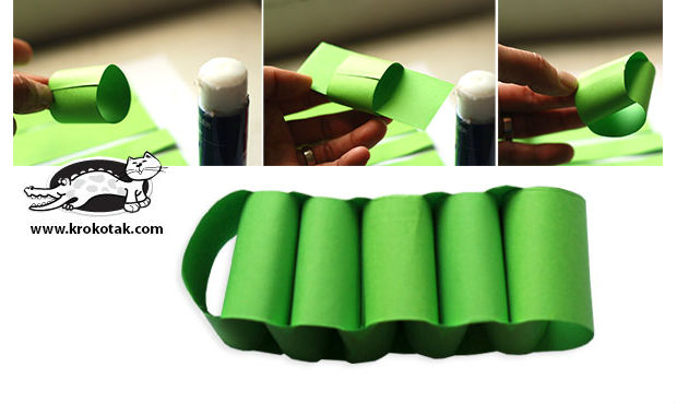 Para fazer o corpo do jacaré, faça pequenos anéis de papel, como na imagem acima, e emende uns sobre os outros.