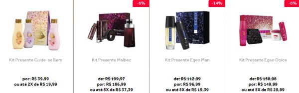 Há versões de kits mais simples e com preço menor, com uma colônia e um hidratante, por exemplo, até kits maiores, e mais caros, possuindo vários itens de uma linha, como o kit Malbec, que possui:
