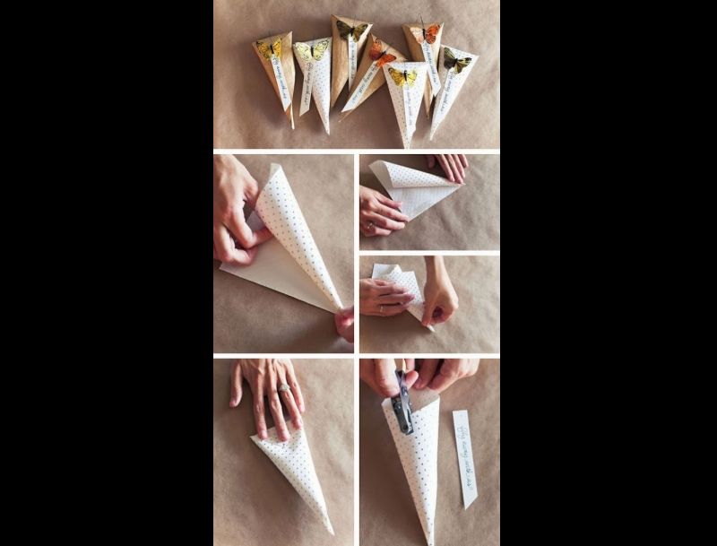 Corte um quadrado no papel e faça um cone com este quadrado. Cole com fita adesiva dupla face. Fure a parte da frente e amarre uma tag, se quiser. Encha o cone com guloseimas. Cole a parte superior com um enfeite.
