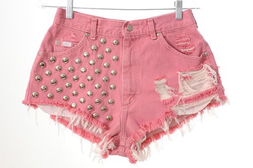 Reaproveite calças jeans e coloridas para criar um shorts moderno. Um shorts rosa, com leve desfiado e peças prateadas inseridas apenas na parte frontal do shorts, fica uma graça.