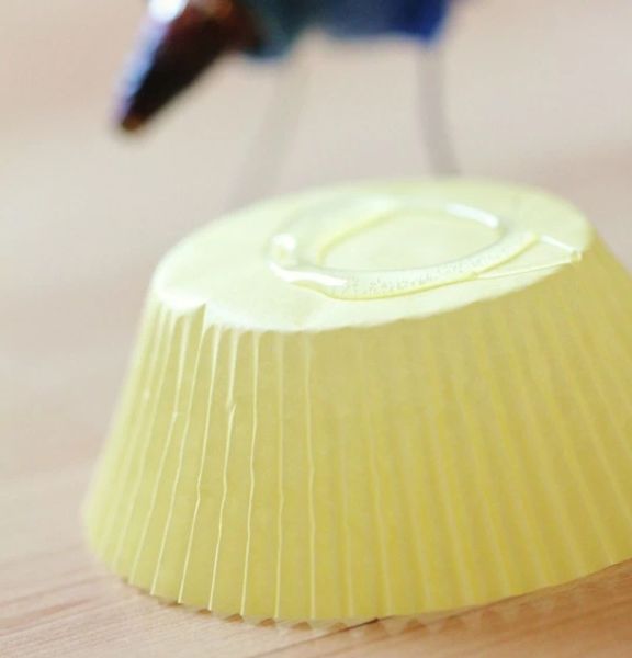 Em seguida, aplique um pouco de cola quente no fundo de uma forminha de doce.