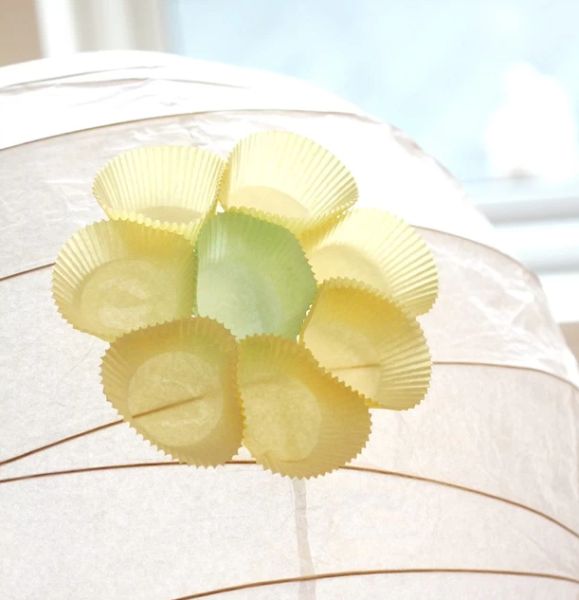 Logo após, cole esta forminha na lanterna de papel e cole mais algumas forminhas ao redor. E se você desejar pode fazer flores estilizadas, como neste exemplo, colando uma cor de forminha de doce para ser o miolo de sua flor e colando uma segunda cor de forminha de doce ao redor deste miolo criado.