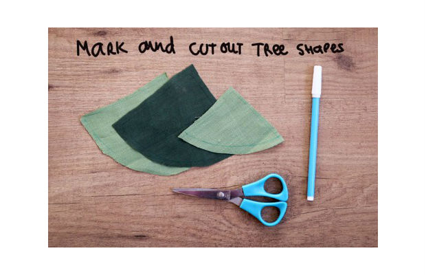 Primeiro, salve o molde da sua mini árvore, imprima e utilize-o para marcar os seus retalhos de tecido.