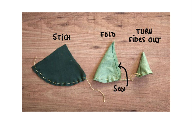 Pregue uma linha de costura na parte inferior de cada peça, como na imagem acima, de modo que você possa formar cones com esses tecidos.