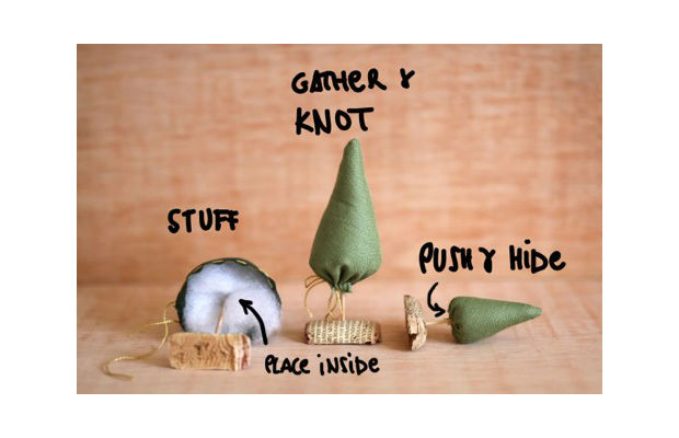 Preencha os cones de tecido com estofamento e fure o final do palito dos troncos de árvores no interior dos cones preenchidos.