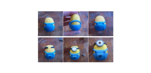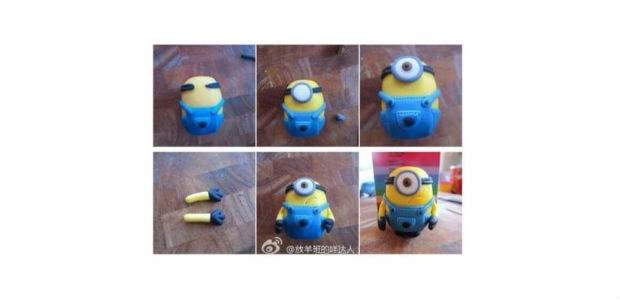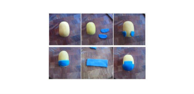 Depois, com uma massa de biscuit azul, faça a roupa dos minions, como na imagem acima.