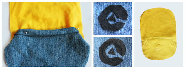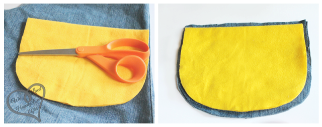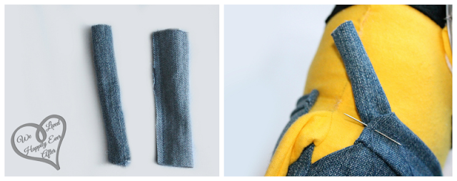 Use duas tiras de tecido azul para fazer a alça do macacão do seu minions.