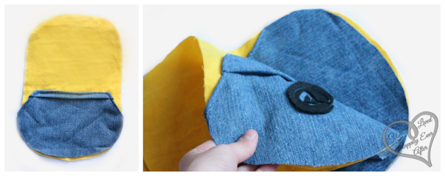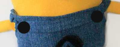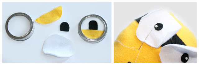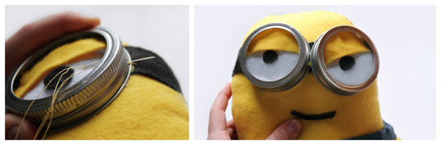 Faça um pequeno círculo, corte-o ao meio e costure-o nos olhos, de modo a fazer as pálpebras do seu Minions.
