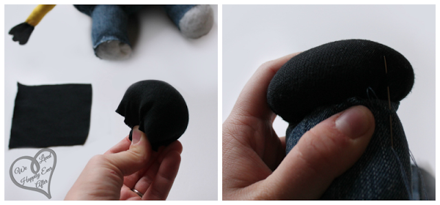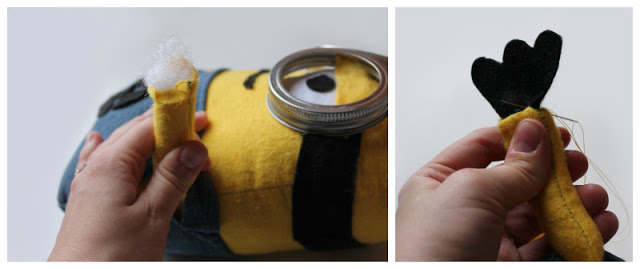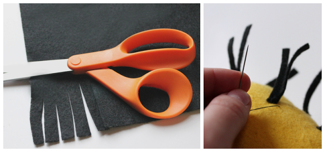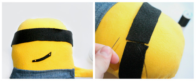 Faça os cabeços do seu Minions com feltro preto e costure fio a fio sobre a sua cabeça.