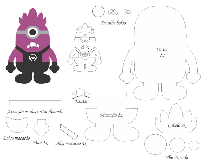 Use os moldes dos Minions a seguir para fazer apliques para fixar na parede, para colocar na capa de caderno ou para decorar o objeto que você quiser.