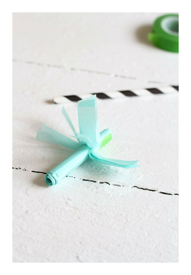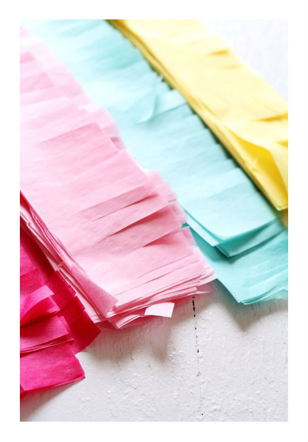 Recorte tiras de papel de seda colorido.