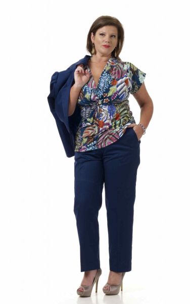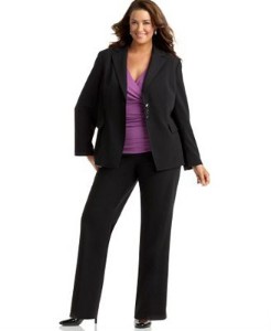A mulher plus size pode usar a calça social para trabalhar, juntamente com um paletó, formando um look monocromático e alongando a silhueta; e as melhores opções são as cores escuras (principalmente o preto) que deixa visualmente seu corpo mais longilíneo. E você também pode usar uma camisa ou blusa colorida por baixo do paletó e, deixá-lo aberto, para chamar a atenção para o centro do corpo.