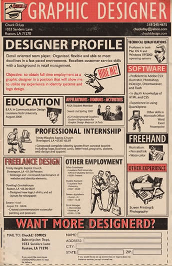 Se você quer atuar em um ramo como esse – no ramo da criação – esta pode ser uma boa pedida. Na hora que for compor o currículo, é preciso que você esqueça por um instante aquelas informações objetivas colocadas em uma página branca e organizadas por meio de tópicos. Faça diferente, inove! A criatividade pode abrir muitas portas!