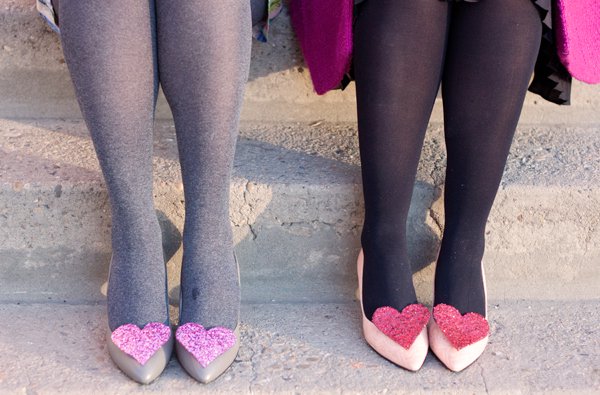Você também pode personalizar seus calçados, basta fazer o modelo de coração de paetês ou ainda usar folha de EVA com glitter e colar na sua peça, fica muito bonito.