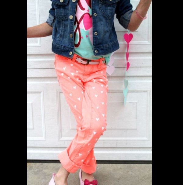 Se você cansar da sua calça básica, basta você cortar dois corações do material desejado e colar com cola de tecido onde fica a dobra do seu joelho na calça.
