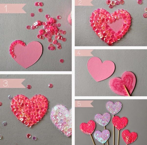 Comece separando todos os materiais que você vai utilizar em seu artesanato. Transfira o coração para o papel e cole paetês em uma das partes ou nele por inteiro. Faça o mesmo com outro coração do mesmo tamanho você pode diversificar as cores dos paetês para combinar coma decoração da sua festa. Depois disso, deixe secar. Para finalizar a sua peça, cole um coração ao outro, com o palito no meio. E está pronto!