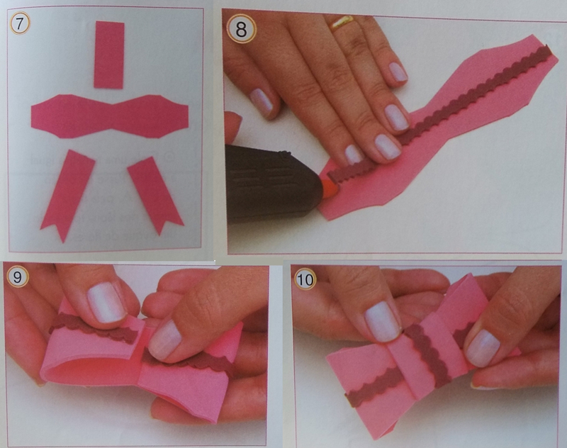 Transferia as partes do molde para o EVA, com o auxílio do palito para churrasco. Recorte. Se você quiser, cole sianinha ou outro enfeite nas partes do laço. Cole as pontas do laço na parte detrás. Cole o meio do laço em seu lacinho.