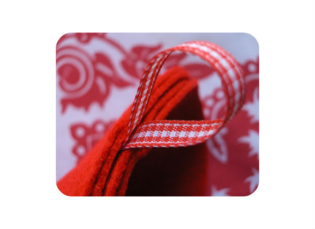 No meio desses feltros deverá ser costurado a fita decorativa, que servirá também como uma alcinha para o enfeite.