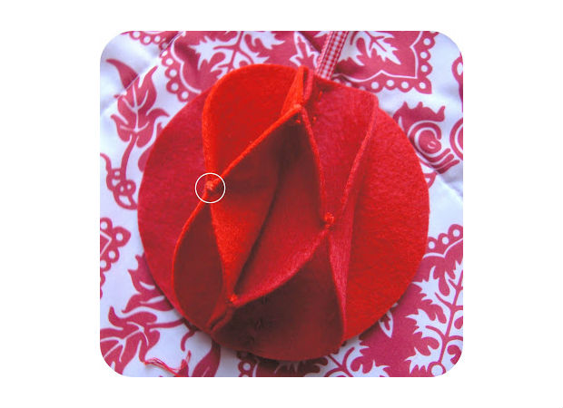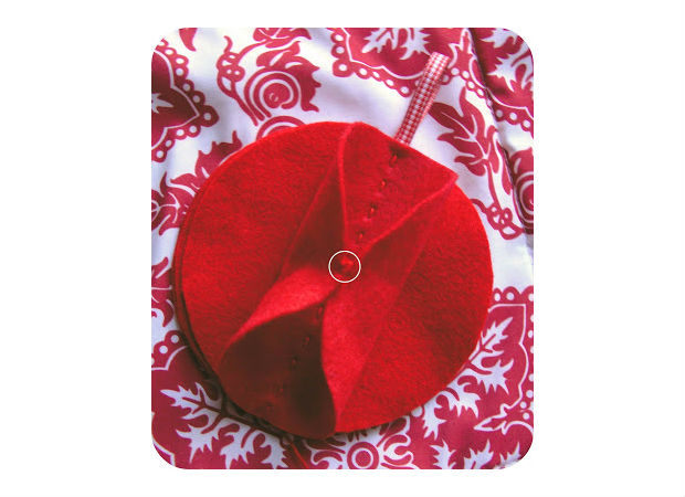 Em seguida, junte as duas laterais do primeiro círculo e faça um pequeno ponto de costura.