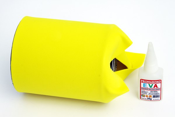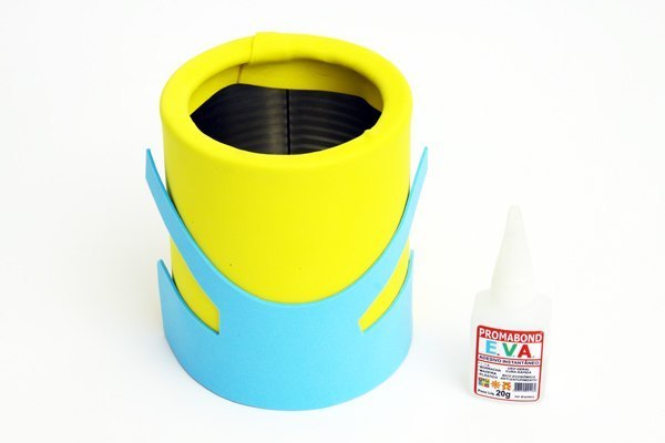 Em seguida, encape a lata escolhida por fora, com a tira amarela de EVA, e colando a emenda com o auxílio da cola para EVA.