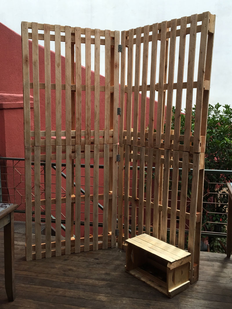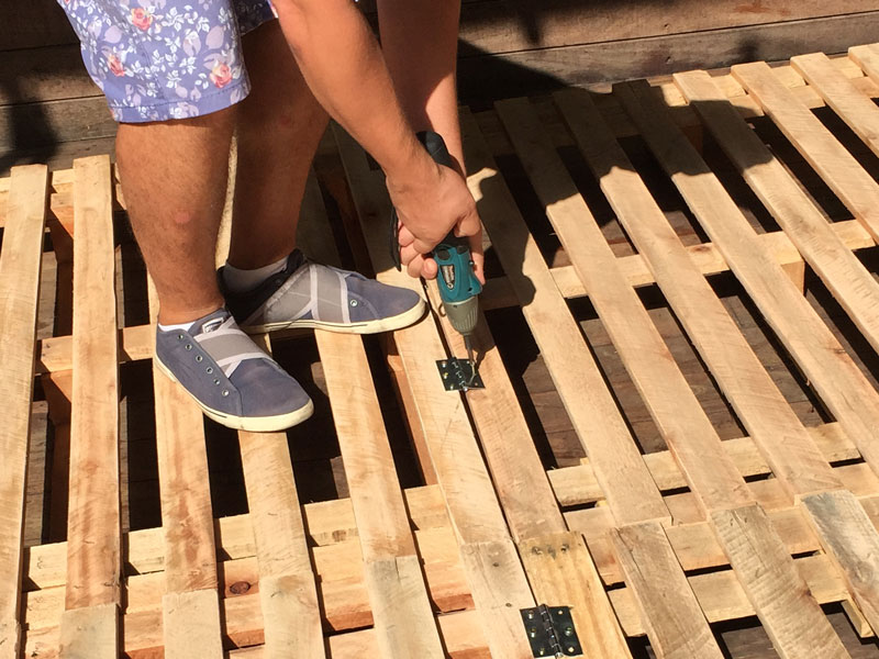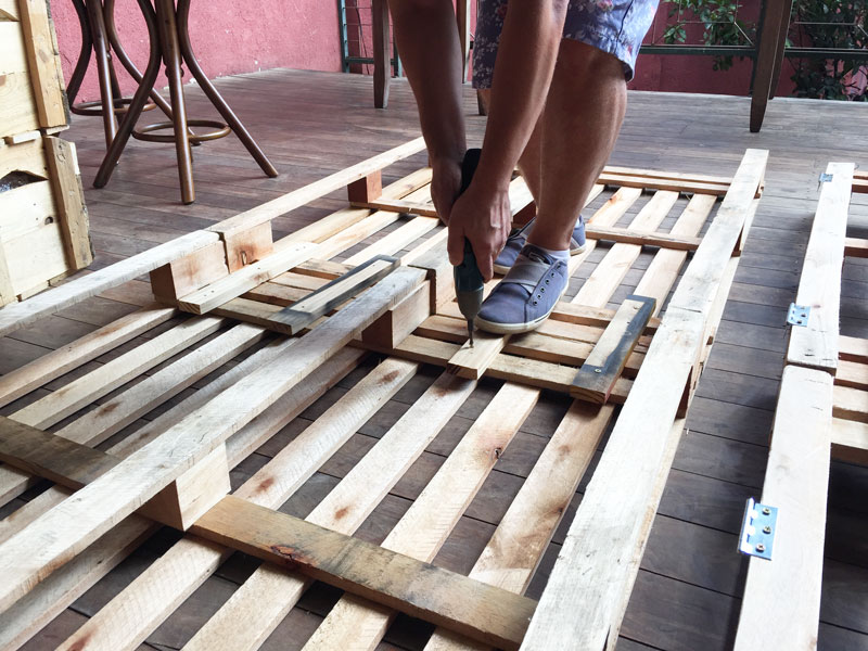 Fixe a dobradiça entre as duplas de pallets, com o auxílio dos parafusos. Em cada pallet você vai fixar duas dobradiças. Meça antes, para ficar harmonioso.
