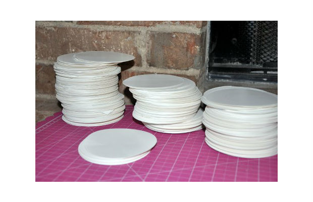 Primeiro, recorte círculos de papel, como os da imagem acima, em grande quantidade.