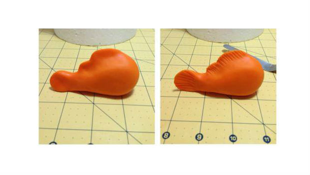 Em seguida, puxe um pouco essa massa para cima, criando as barbatanas do seu peixinho.