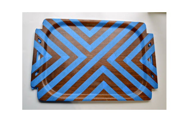 A seguir, cole fitas adesivas sobre a bandeja, formando o desenho que você gostaria que ficasse a sua pintura. Na imagem acima, você pode tirar uma ideia.