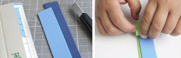Corte tiras de EVA coloridos, medindo essas tiras de acordo com a sua régua.