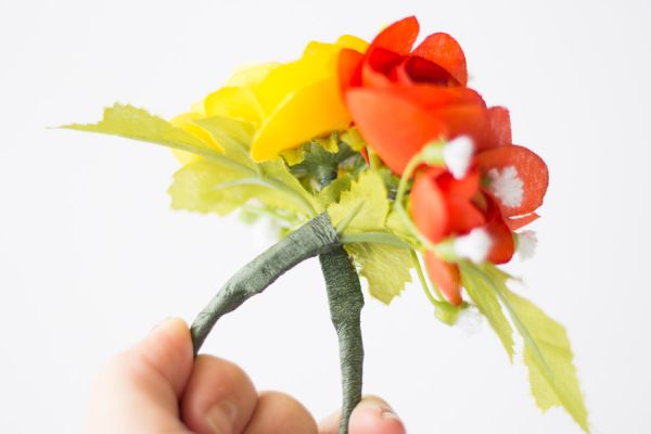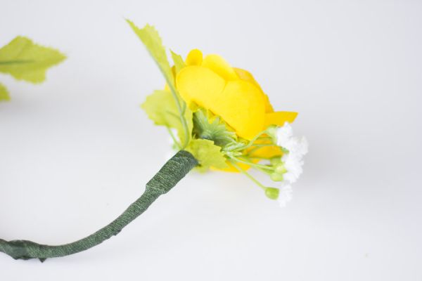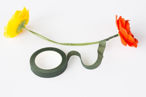 Em seguida, separe duas flores que você queira usar e una estas duas flores, pelos caules, com o auxílio da fita floral, que deve ser enrolada ao redor dos dois caules, e que devem estar posicionados um de frente para o outro.
